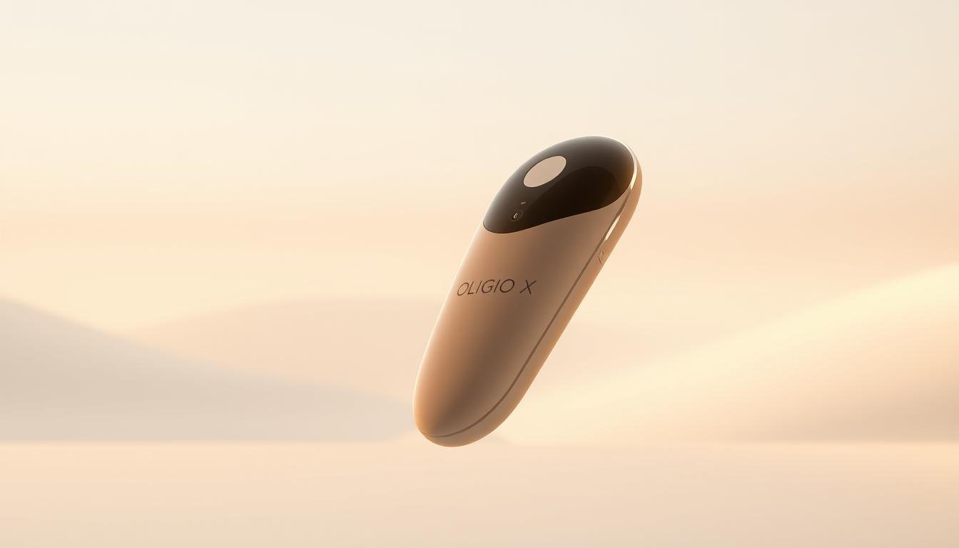 Oligio X 原美電波國際認證: a sleek, modern composition showcasing the Glowin Beaute Oligio X device against a clean, minimal background. Soft, natural lighting illuminates the device, highlighting its premium, matte finish and elegant, minimalist design. In the foreground, the Oligio X is prominently displayed, its curves and contours captured in crisp detail by a medium-close lens. The middle ground features three stylized icons representing the device's key international certifications, subtly integrated into the composition. The background is a serene, neutral gradient, allowing the product and its certifications to take center stage in a sophisticated, high-end aesthetic.